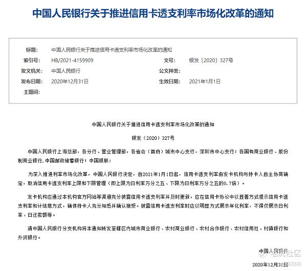 近日,央行发布《关于推进信用卡透支利率市场化改革的通知》(银发〔2020〕327号)(以下简称“《通知》”)。