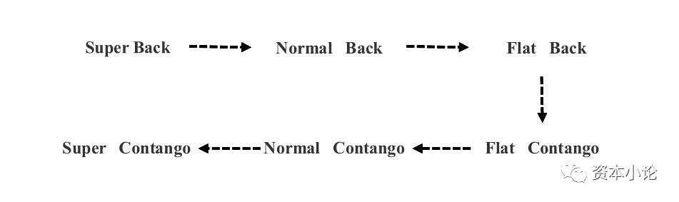 随着上涨行情的结束,商品的期限结构又会开始新的变动,运动的变化形式如下: