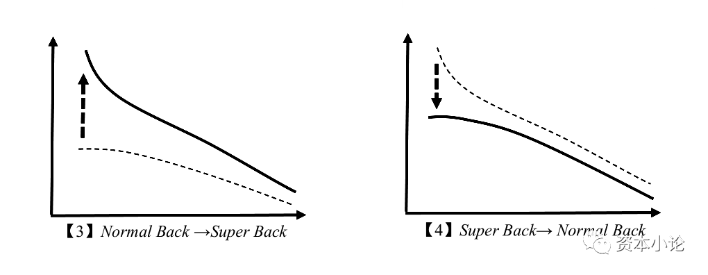 熟悉的读者都很清楚:由【1】到【2】再到【3】是Backwardation结构扩大的一个过程,也是一个期现价格分布由平缓到陡峭的过程。由【4】到【5】再到【6】的过程则正好相反,是一个Backwardation结构缩窄的过程,也是一个期现价格分布由陡峭到平缓的过程。