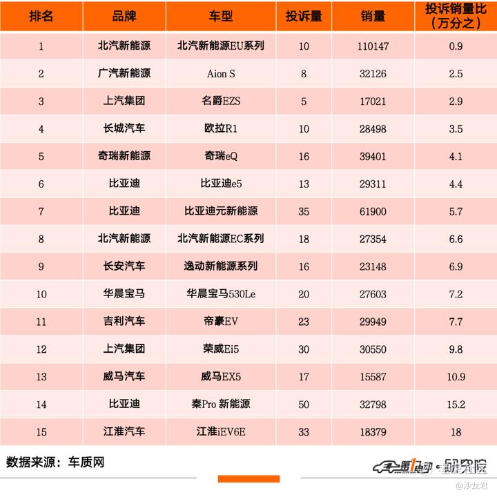 榜单前15名汇总,投诉销量比最高的几个有比亚迪秦、威马EX5、帝豪、北汽等,特斯拉并未在列。