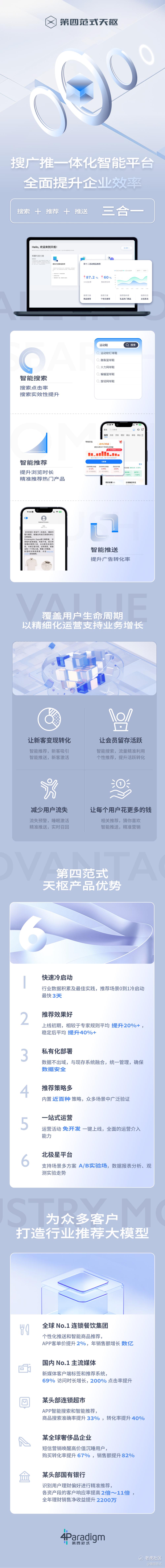 天枢拥有全面的用户画像分析、端到端的搜索推荐一体化、一站式流量运营管理等能力,集合智能搜索、智能推荐和智能推广三大能力于一身,以提升用户留存、新客转化,减少用户流失,提升客单价及购买频次为目标,持续赋能,助力企业实现用户全生命周期(LTV)的精细化流量运营及精准营销。