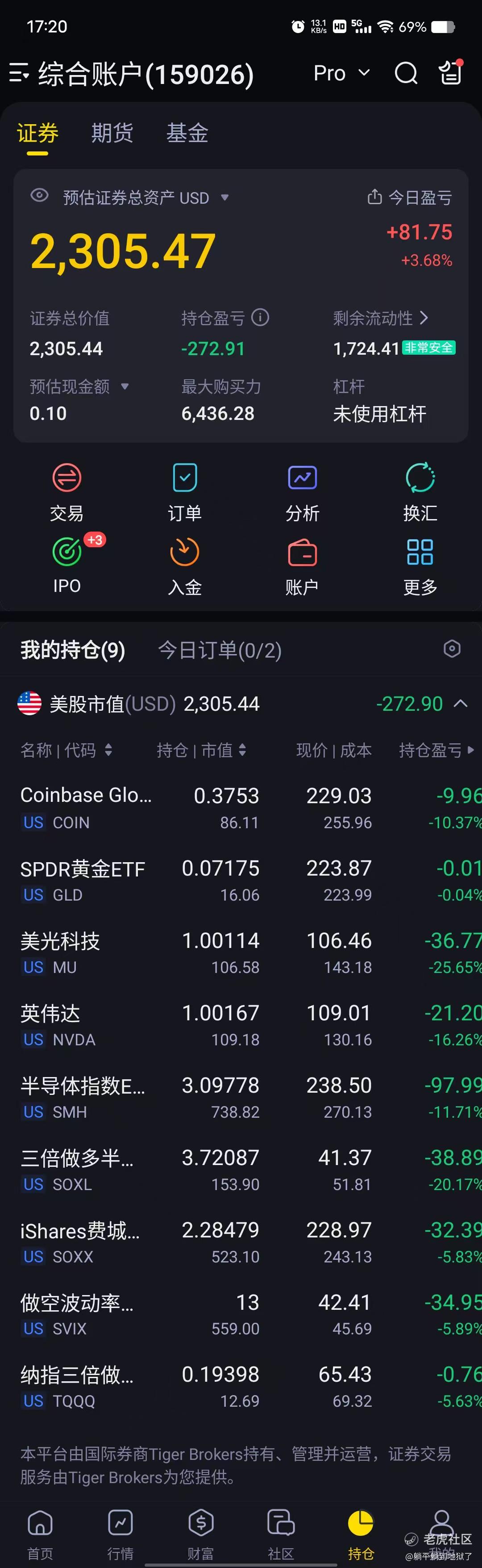 昨日TQQQ实盘同步操作:无操作,当前持仓9份被套。计划:等收盘上5日均线加仓,或6小时M第三次金叉加仓。