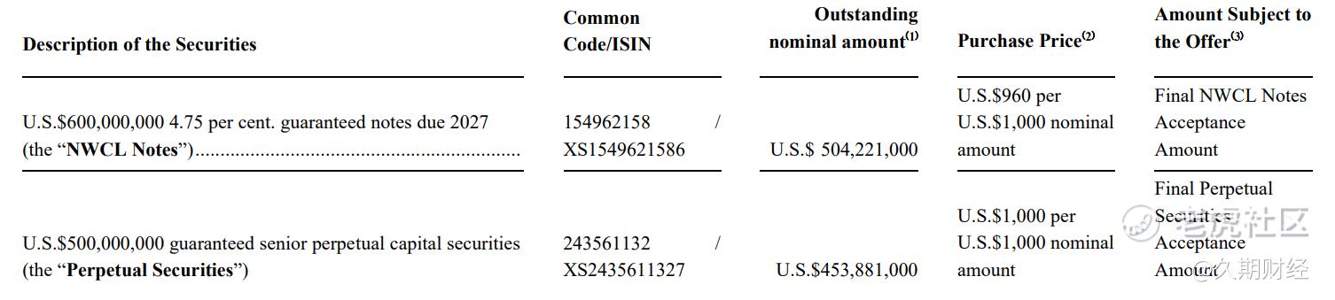 久期财经讯,8月1日,新世界发展有限公司(New World Development Company Limited,简称“新世界发展”,00017.HK)发布公告,对NWDEVL 4.75 01/23/27(ISIN:XS1549621586)及NWDEVL 6.15 PERP(ISIN:XS2435611327)发出现金购买要约。