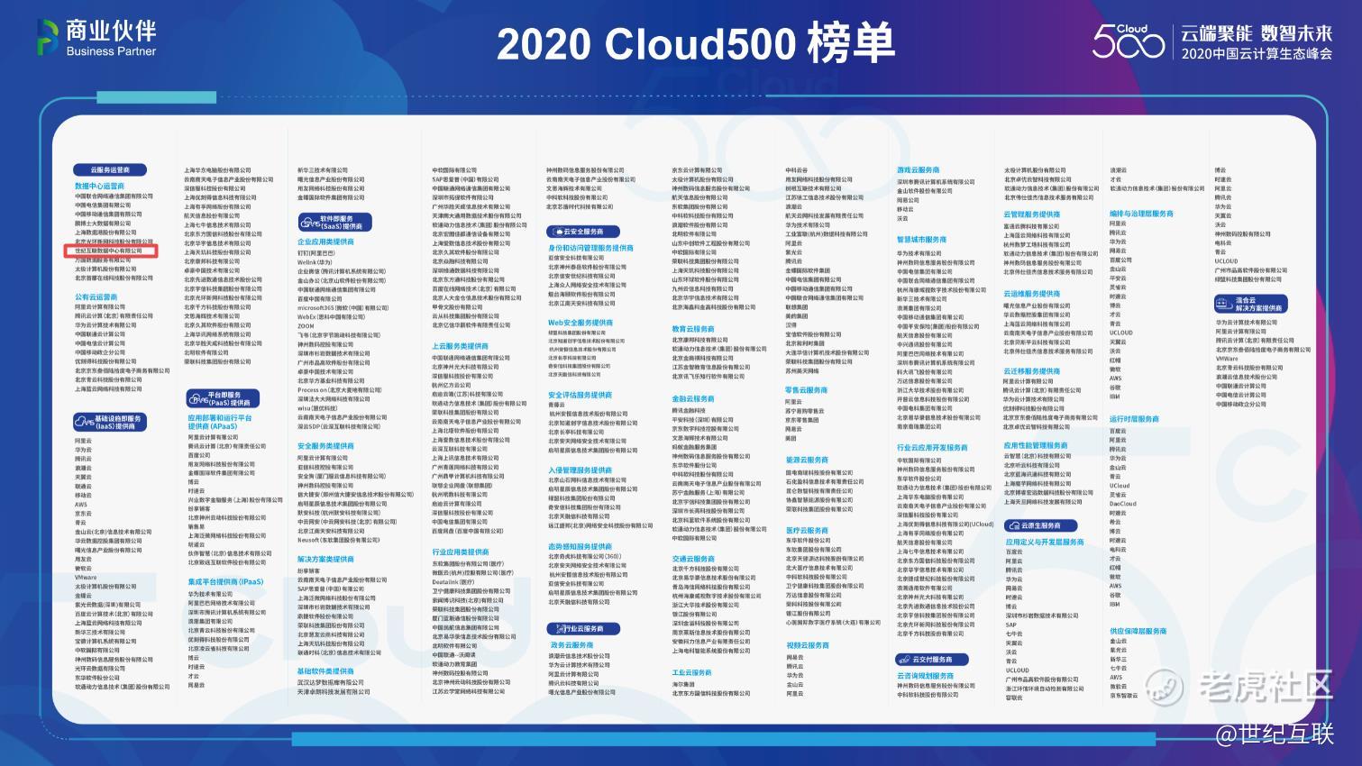 12月29日, 由B.P商业伙伴、中国IT服务全媒体平台联合主办的“云端聚能 数智未来”2020中国云计算生态峰会(线上会议)在京举行,会上重磅公布了全国百万企业上云服务商图谱,世纪互联凭借亮眼的市场表现以及优异的产品功能表现强势入围 “2020云计算云生态500强(Cloud500)” 榜单中的“中国云服务运营商”阵营。