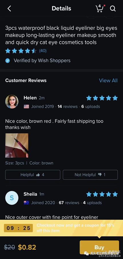 关于月活,Wish通过10年的积累,已经深入100个国家,买家月活达到1亿多,并且链接了50万的商家,已经是全球除了亚马逊、速运通(阿里旗下)之外最大的跨境电商平台。月活是互联网平台最核心的数据,Wish的月活虽然只有拼多多的1/9,但是人群复杂,更具有壁垒。为了增加月活,Wish更加大力发展南美洲等欠发达的国家,通过低价、拉新、红包、消费券等活动吸引消费者停留并且购买。至于拼团增加月活,指日可待。下图为新用户注册购买眼刷,原价20美元,现在只需要0.82美元,中国发货,这不就是拼多多的雏形么?