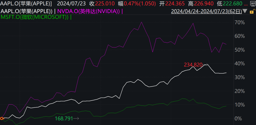 今年以来,美股市值摸到3万亿美元门槛的公司一共有三家,第一名苹果(约3.5万亿美元)、第二名微软(约3.3万亿美元)、第三名英伟达(约3.0万亿美元)。