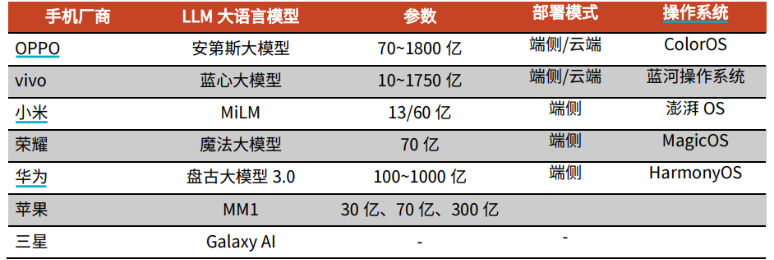 自此,AI手机正式开卷。对于手机厂商而言,因为大模型目前基本都是外接如OpenAI、谷歌,以及百度等的;从硬参数上,大家卷的无非是端侧LLM大语言模型的参数量,以及在端侧支持这些模型运算的NPU的实力。
