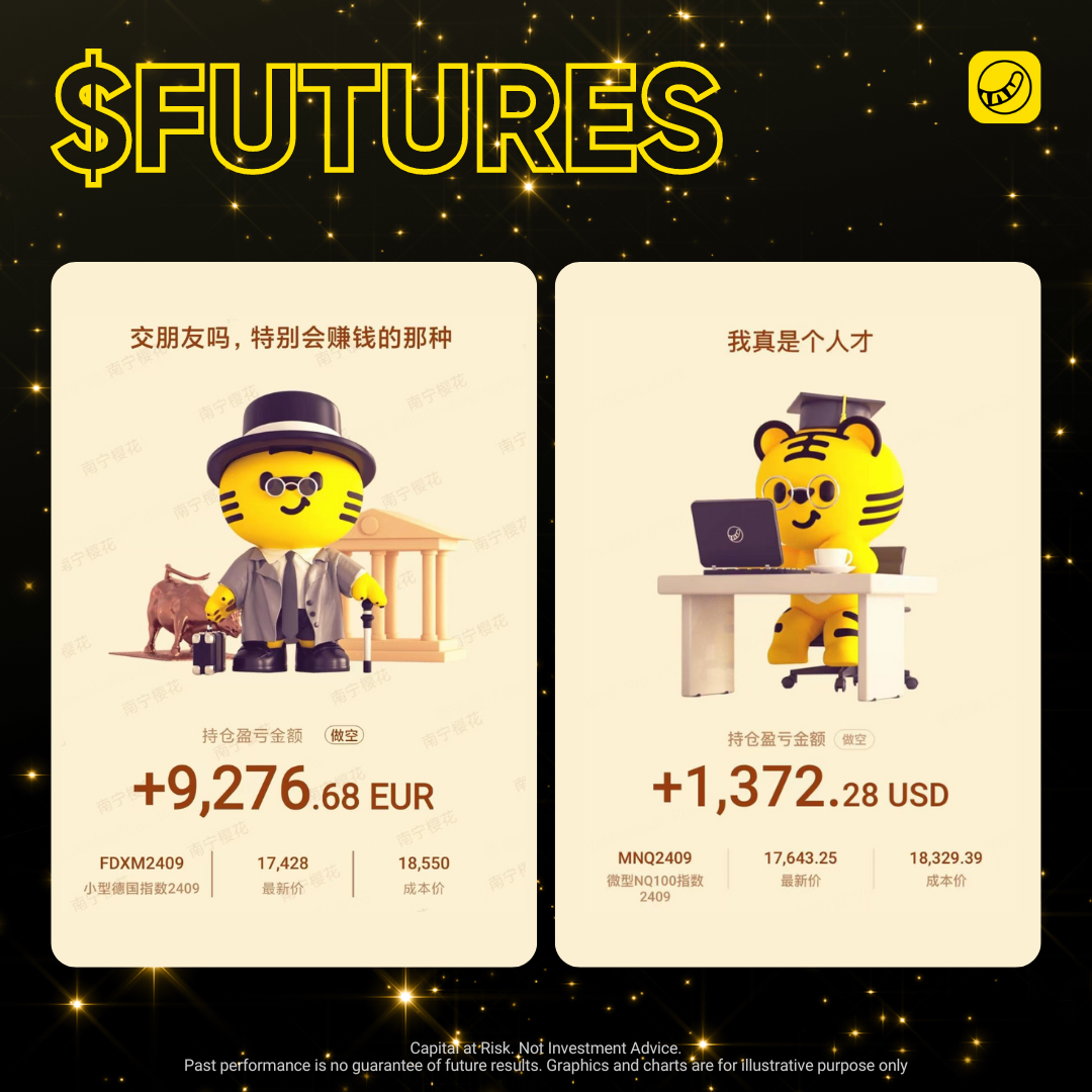 恭喜虎友 @K.S. 通过做空 $微型NQ100指数2409(MNQ2409)$ ,获得1372美元的期货收益