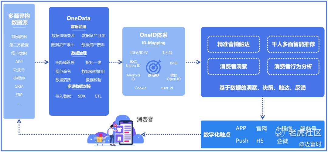 OneID实现数据归一:成功整合百度、头条、阿里、腾讯等多渠道数据,与订单系统、官网、掌银APP等内部数据「无缝对接」,确保数据准确性和一致性。