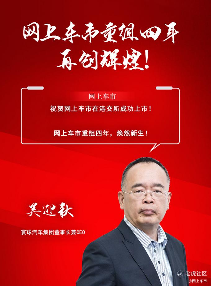 寰球 汽车 集团董事长兼CEO吴迎秋先生,预祝网上车市港交所成功上市!吴迎秋先生表示:“祝贺网上车市在港交所成功上市,网上车市重组四年,焕然新生!”