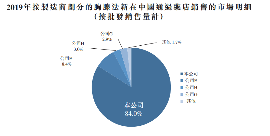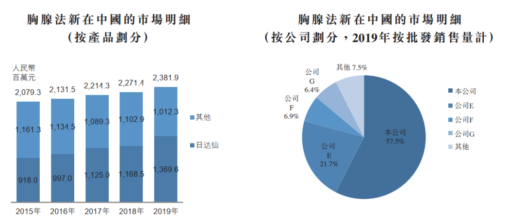 在中国的胸腺法新市场中,日达仙于1996年获批,是首个品牌胸腺法新药物。自2015年至2019年,就收入而言, 日达仙的销售额分别**国胸腺法新市场的44.1%、 46.8%、 50.8%、 51.4%及57.5%,证明在中国胸腺法新市场的市场份额增加以及持续超越竞争对手的强大实力。