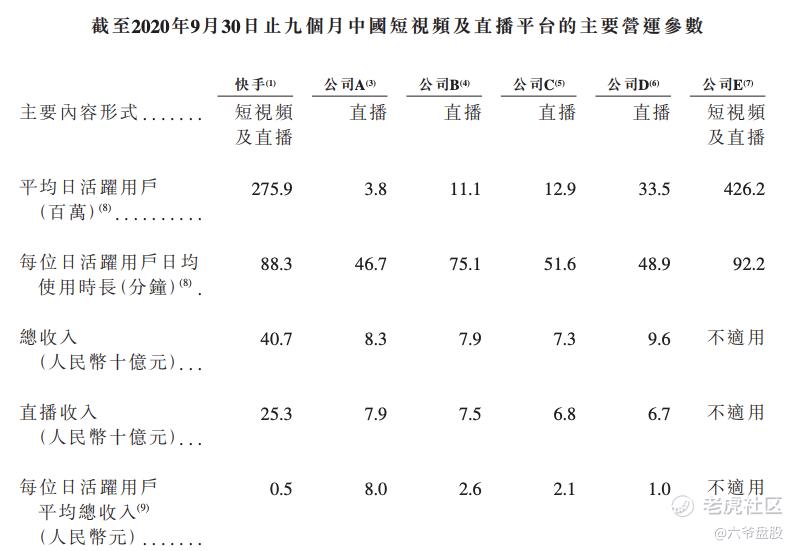 快手是领先的内容社区和社交平台。公司持续改进内容生产工具和服务,让人们更便捷地记录和分享生活、呈现和发挥所长;提供更有效的内容发现机制,让人们更容易发现其他创作者及优质内容。公司希望和所有价值创造者一起努力,为用户提供更多产品和服务,丰富大众的选择。根据艾瑞咨询,截至2020年9月30日止九个月,全球范围内,快手是以虚拟礼物打赏流水及直播平均月付费用户计最大的直播平台;以平均日活跃用户数计第二大的短视频平台;以及以商品交易总额计第二大的直播电商平台。