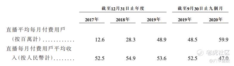 虽然营业纪录期间直播平均每月大约用户一直增加,但集团的直播每月预定用户平均收入由2018年的人民币54.9元减至2019年的人民币53.6元,再由终止2019年9月30日止九个月的人民币52.5元减至至2020年9月30日止九个月的人民币47.0元,主要是由于用户基础迅速扩大,而新用户一般需要重新才形成一项习惯。集团日后会持续培养护用户习惯和提升整体用户体验,预料可提高每月的用户平均收入。