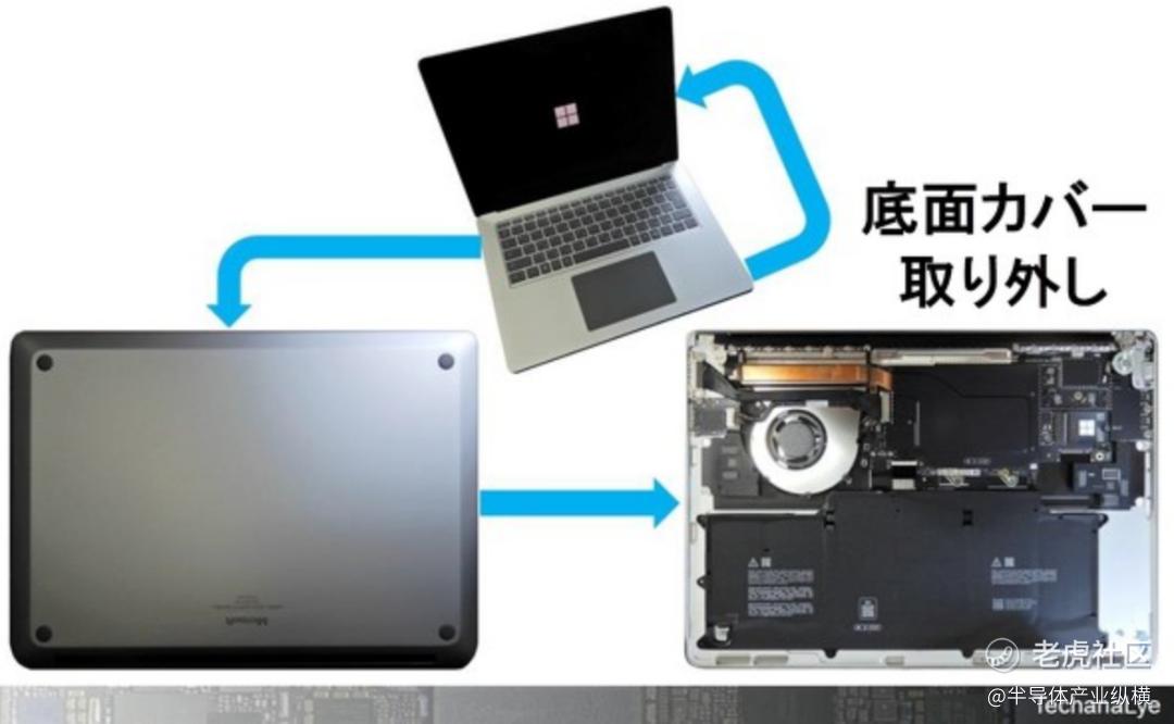 图 2显示了移除空气冷却装置的 Surface Laptop。一个冷却风扇和连接处理器和风扇的热管(传热)占据了内部空间的四分之一左右。拆下热管可以看到装有处理器的电脑板。电脑板如图2右上角所示。大致位于电脑板中央的是高通主处理器,处理器右侧是带有 Microsoft Windows 徽标的 SSD。