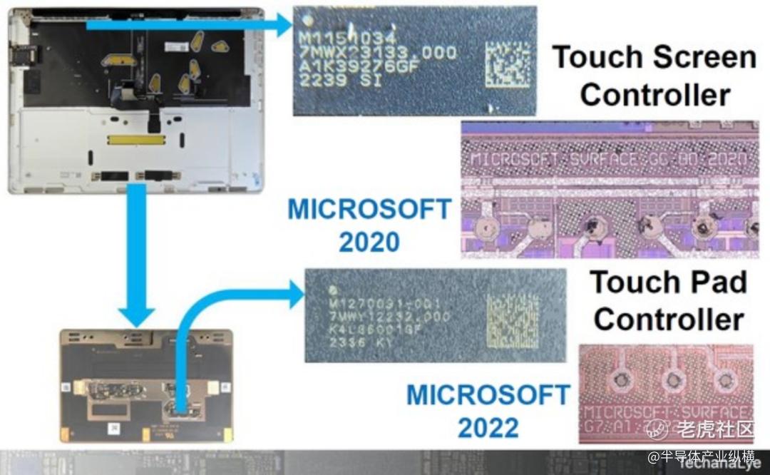 图 4显示了 Surface 笔记本电脑的触摸芯片。微软的 PC 处理器使用英特尔、AMD 和高通,但在差异化和优势方面使用自己的芯片。Surface Laptop 的显示屏触摸控制器和触摸板控制器是内部制造的。不仅商用芯片的封装发生了变化,而且芯片上还可以看到Microsoft和Surface的字样。两者都是新芯片,具有 2020 年以后的年份信息。