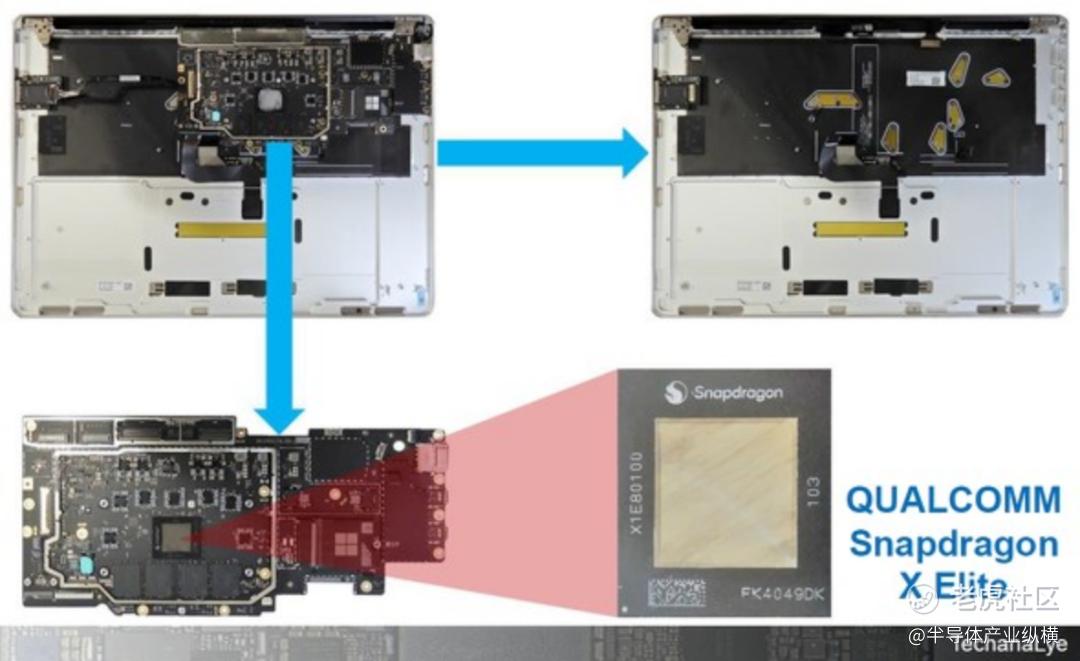 如图3右下所示,板上安装了高通的PC处理器“Snapdragon X Elite”。高通多年来一直致力于Windows PC处理器的开发,上一代处理器是“Snapdragon 8cx”系列(微软发布为SQ系列)。Snapdragon 处理器以及 Intel 和 AMD 版本已在 Microsoft 产品中使用多年。