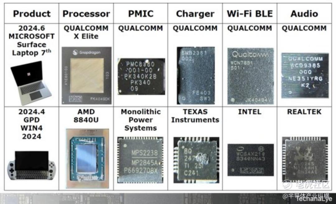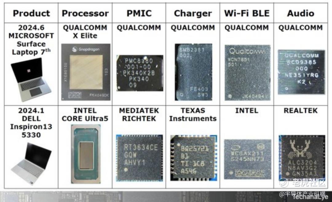 表 1是兼容 Copilot+ PC 的 Surface Laptop 和 2024 年 1 月发布的 DELL PC 的内部比较。戴尔PC采用英特尔新处理器“Core Ultra”。英特尔芯片是处理器和Wi-Fi,所有其他芯片均由中国台湾或美国PC半导体制造商制造。