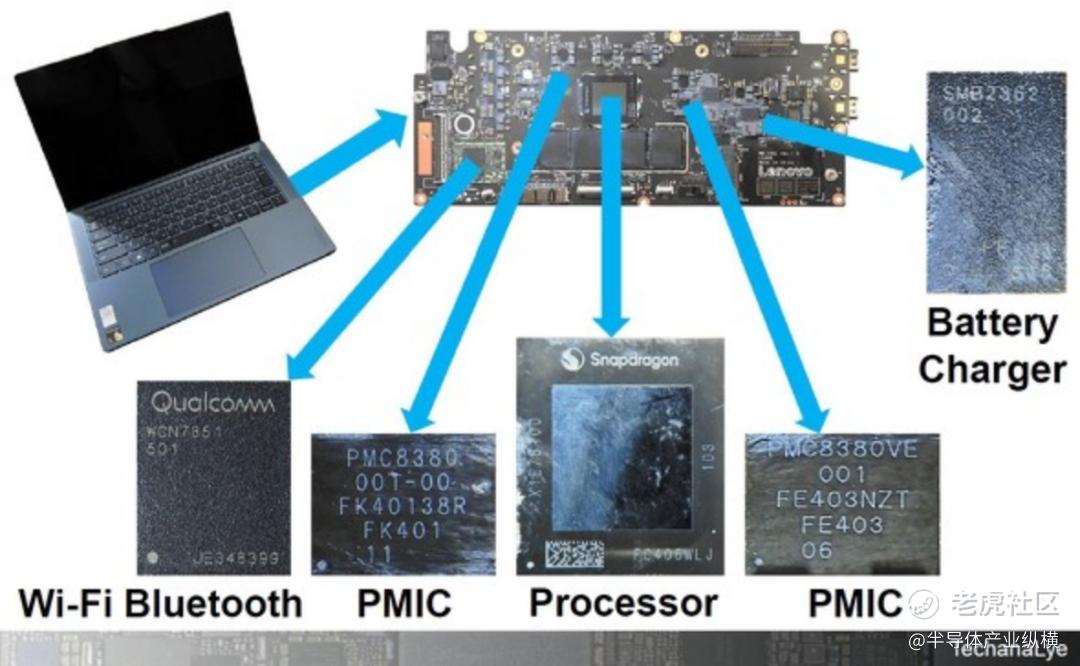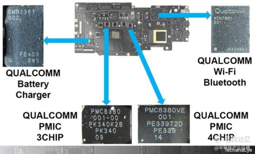 图 5显示了 Surface Laptop 主板上除 Snapdragon X Elite 之外的高通芯片。主板大部分由高通芯片组成。供电系统、电池充电系统、Wi-Fi蓝牙通信等均由高通制造。它是构成系统的芯片组。通过使用芯片组可以轻松优化性能和功能。
