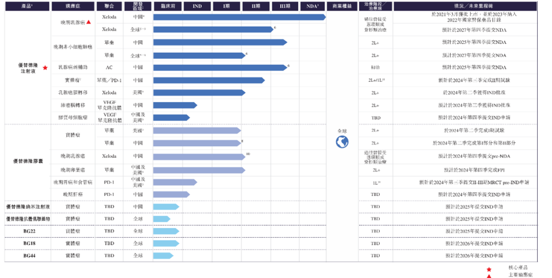 优替德隆注射液于2023年1月被纳入国家医保药品目录,用于治疗既往接受至少一种化疗方案的复发或转移性乳腺癌。截至2024年5月31日,优替德隆注射液用于乳腺癌新辅助治疗的III期临床试验、在中国用于晚期NSCLC的III期临床试验,以及用于晚期NSCLC的II至III期MACT实验均为优势头对头比较实验。