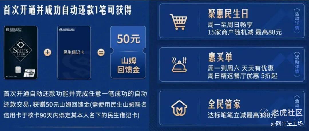 上述返利将以山姆回馈金的形式自动返还到山姆会员回馈金账户。山姆回馈金是山姆持续提升会籍价值的重大升级,于8月1日与民生山姆联名信用卡同步上线。与此同时,客户的民生山姆联名信用卡如绑定了其本人名下的民生借记卡,首次开通自动还款功能并完成一笔自动还款交易,还可获得价值50元的山姆回馈金。此外,民生山姆联名信用卡还为客户提供了聚惠民生日、惠买单、全民管家等服务,覆盖随机减免、5折买单、立减最高188元等多项权益。