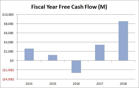 下个月我想知道的另一个主要项目是公司的回购计划进展如何。 如果你还记得的话,大约六个月前,董事会批准了一项100亿美元的股票回购计划,作为从本财政年度开始向投资者返还至少50% 自由现金流计划的一部分。 正如你在下面的图表中看到的,去年看到了一个非常好的自由现金流量数字,但是压力很大的收入和资本支出的增加可能意味着今年的自由现金流量数字更加正常。