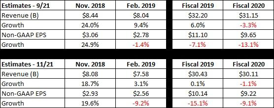 美光的问题在于DRAM和NAND定价。这位分析师预计,美光未来两个季度的NAND合约定价将在15%左右下降,他认为这将意味着美光的毛利率和每股盈馀(EPS)将连续八个季度下滑。自该公司几个月前发布当前季度(2018年11月)的下行预估以来,分析师的预估一直呈下行趋势,如下表所示。