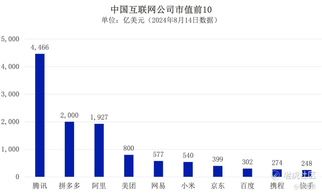 腾讯是中国已上市互联网公司里面最值钱的,目前市值约3.48万亿港元,约等于4466亿美元,比第二名拼多多和第三名阿里的市值加起来还要多。