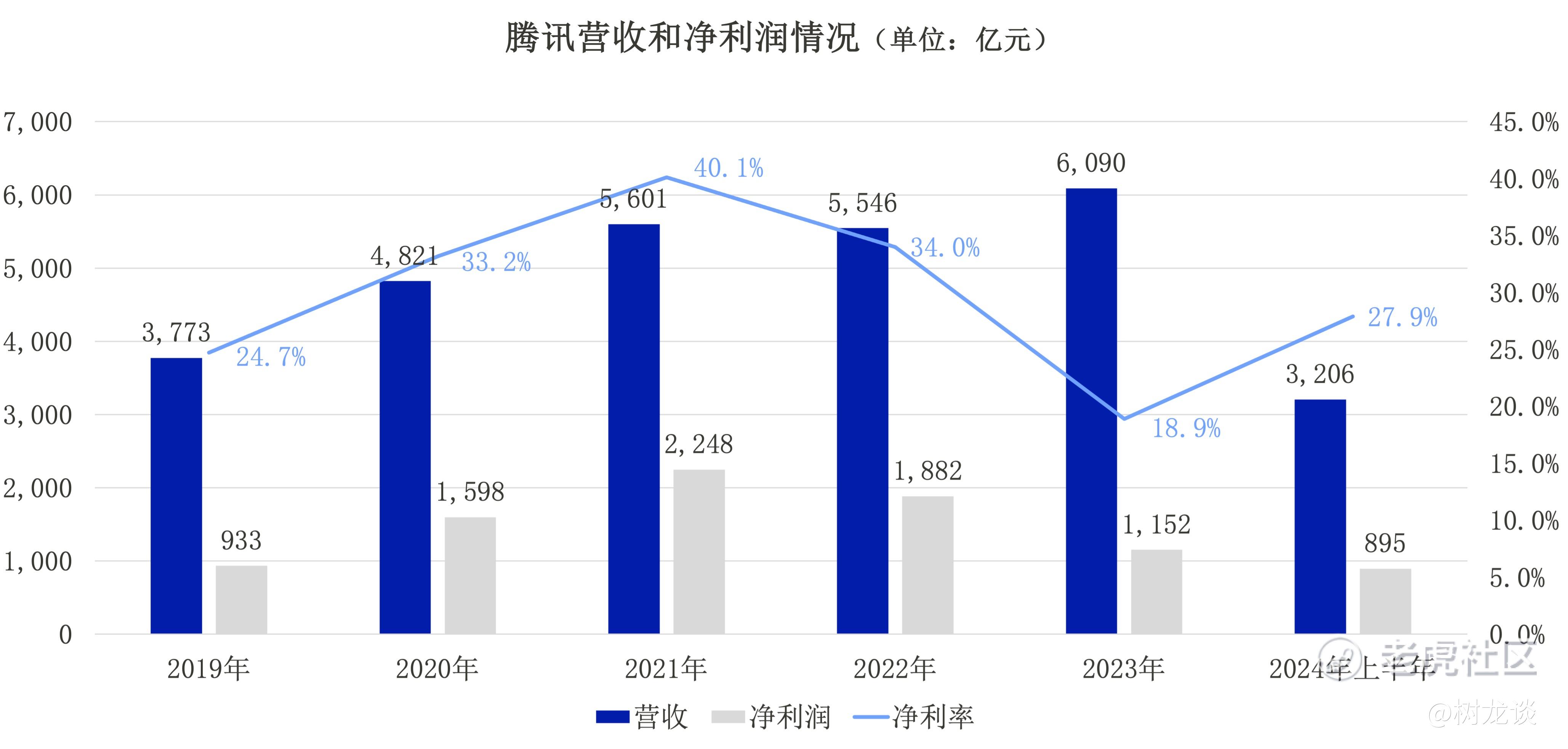 2024年上半年,腾讯营收3206亿人民币,同比增长7%;净利润895亿人民币,同比增长72%。