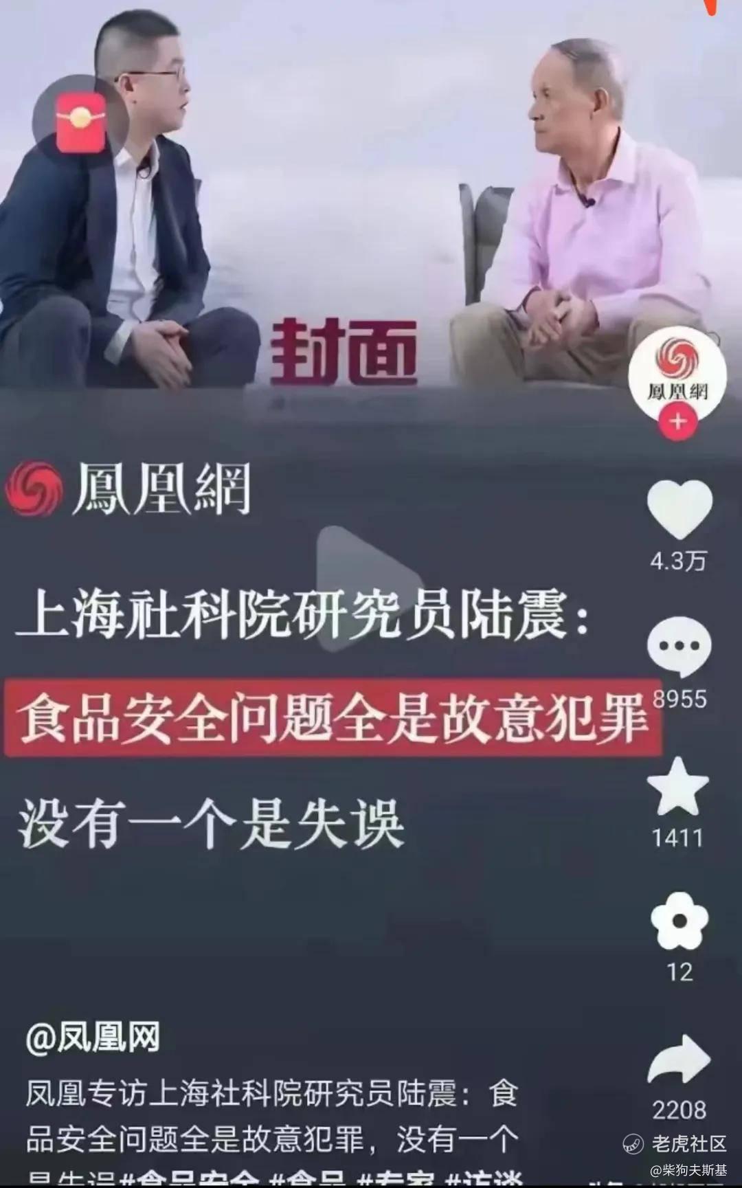 另外,在凤凰网的一档对话节目中,上海社科院研究院陆震也表示:食品安全问题全是故意犯罪,没有一个是失误……