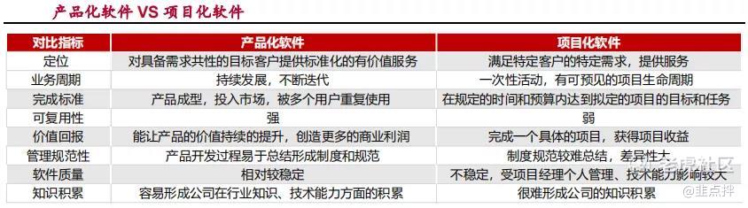 再从另一个角度来分析行业,SAAS 是软件行业的高级阶段,但并非所有的软件企业都能完成SAAS 化转型。广义而言,软件可以分为产品化和项目化两类,以产品为核心业务的软件公司将更为受益于 SAAS 浪潮。