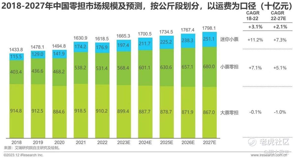艾瑞咨询在《2023年中国零担行业研究报告》预计2022-2027年我国迷你小票、小票零担将分别有7.3%、5.1%的年化增长,好于大票零担可能出现的负增长表现。
