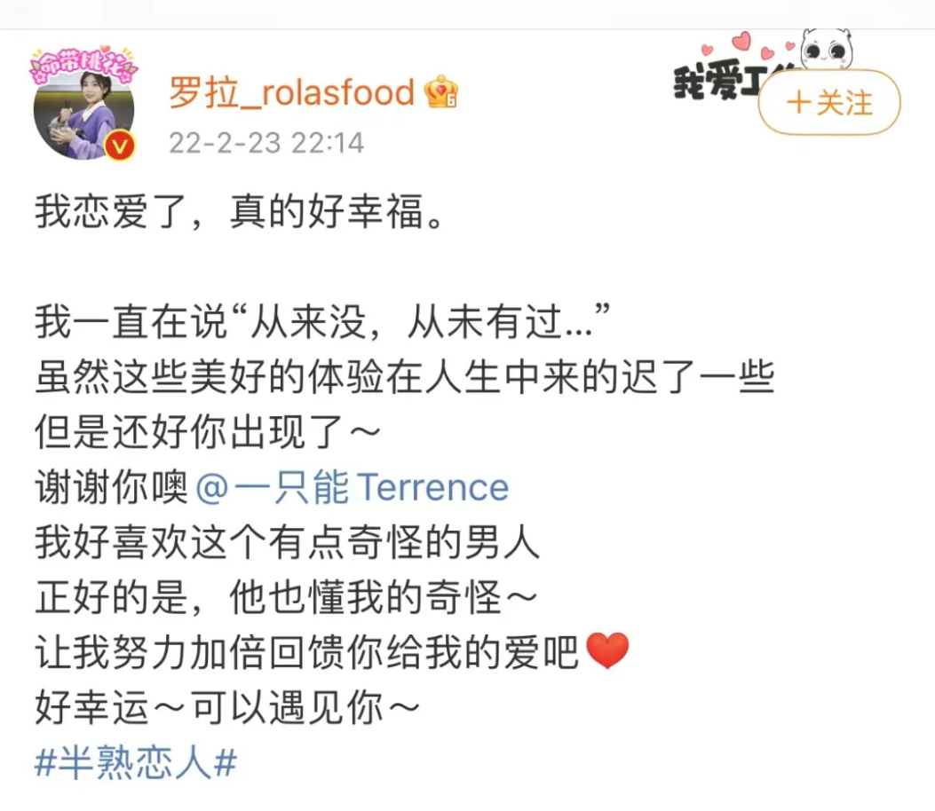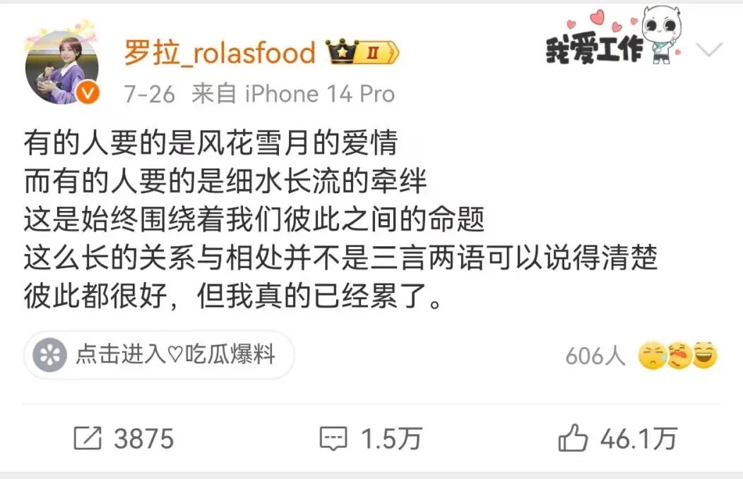 罗拉发博暗指,男方只想恋爱不愿踏入婚姻。随后,男方的回应一味强调自己的物质付出,被网友们评价:“爱是常觉亏欠,而不是常觉亏损”。
