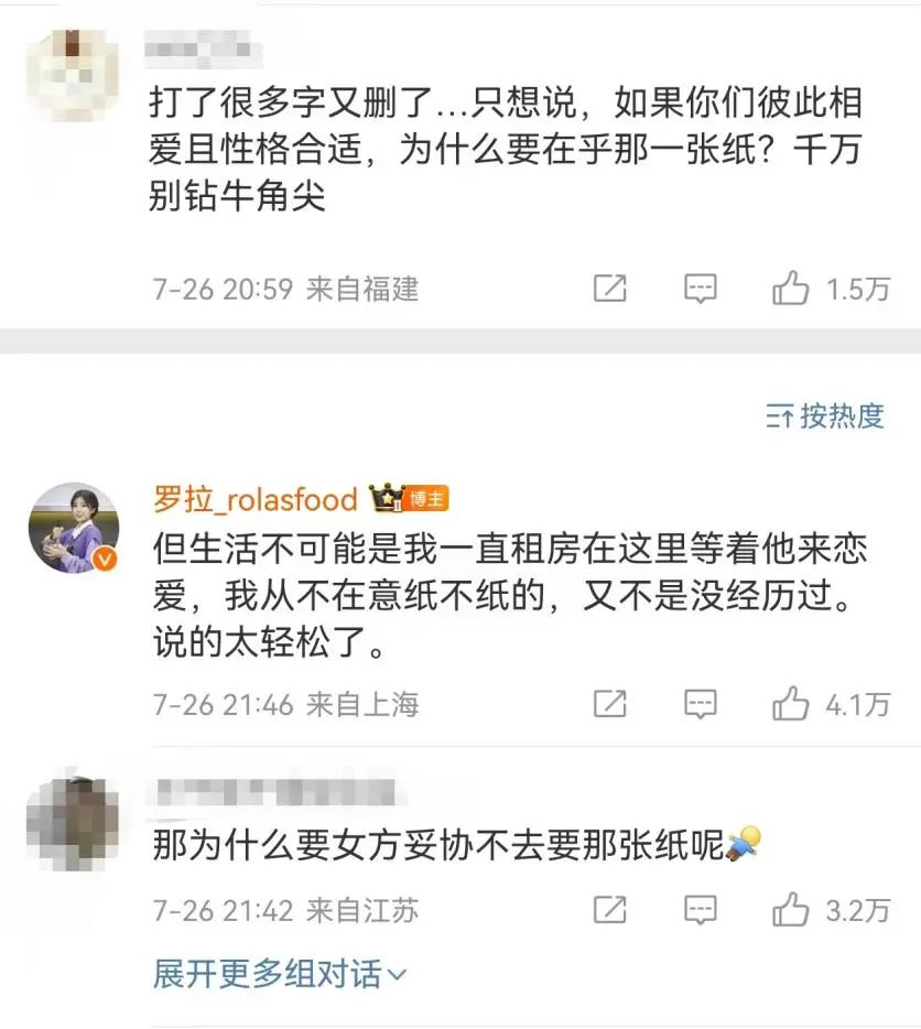 在这条动态下,有粉丝留言劝和:“如果你们彼此相爱且性格合适,为什么要在乎那一张纸?千万别钻牛角尖”。