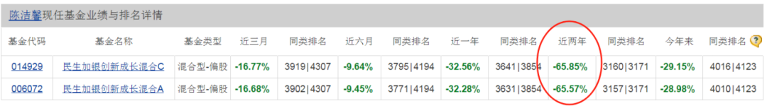 具体来看,陈洁馨目前管着两只基金,民生加银创新成长混合C近两年亏损65.85%,民生加银创新成长混合A近两年亏损65.57%。