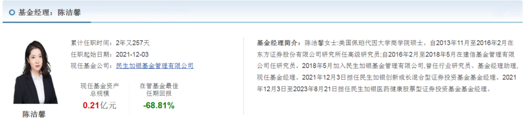 她的履历也不错。公开资料显示,陈洁馨是美国佩珀代因大学商学院硕士,2013年11月至2016年2月在东方证券研究所任高级研究员,后来还在建信基金待过,2018年5月加入民生加银基金,历任行业研究员、基金经理助理和基金经理,也算是经验丰富。