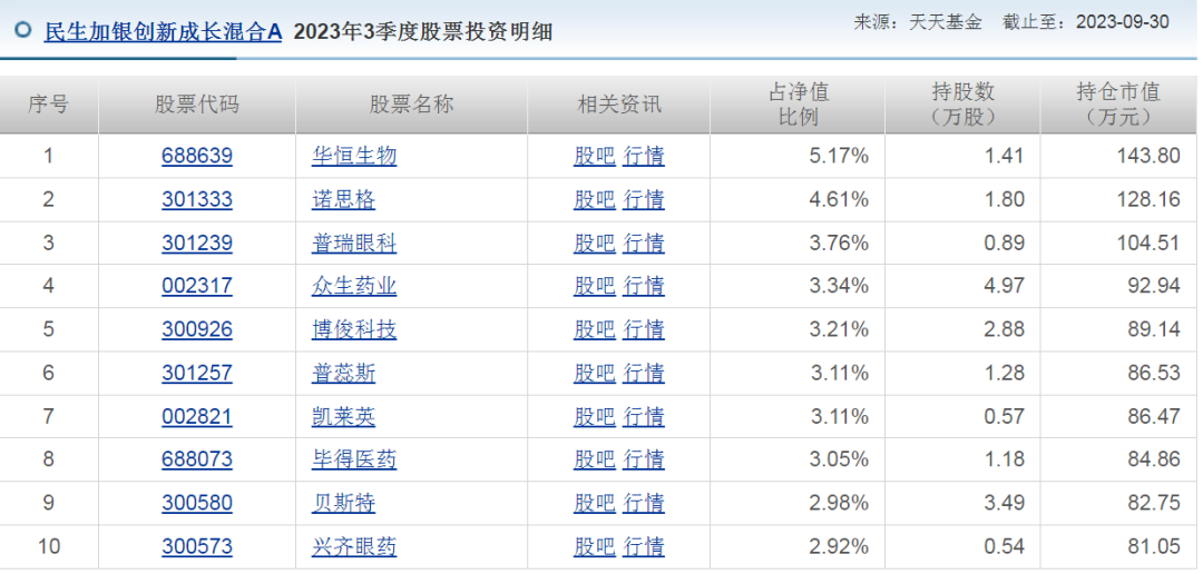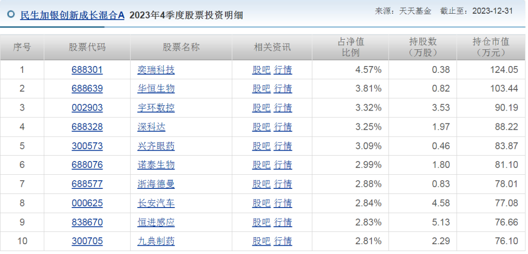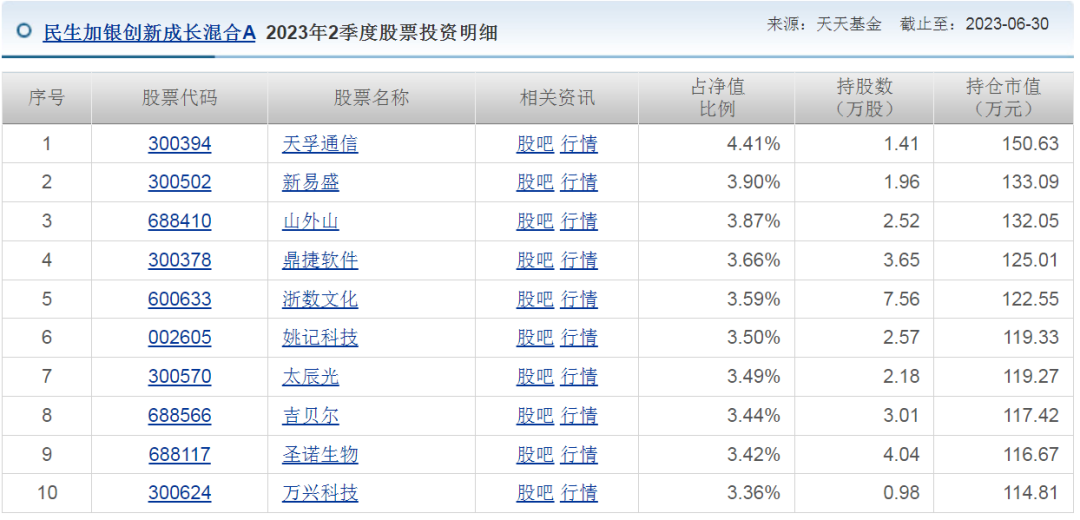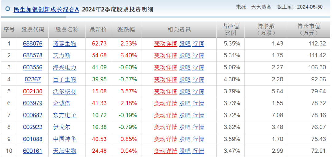 我们来看看她旗下基金的持仓。以民生加银创新成长混合A为例,2024年2季度前十大持仓是这样的: