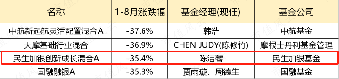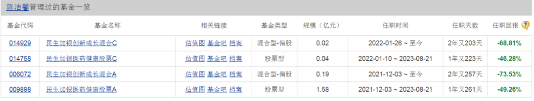 再看陈洁馨过往管理过的基金,同样是一片绿色。其中民生加银创新成长混合A的任职回报更是为-73.53%,这真是亏麻了。
