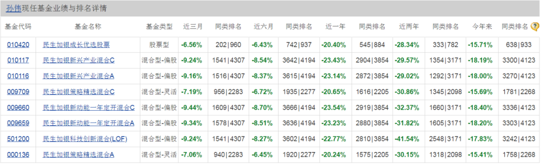 还有孙伟,累计任职时间10年又43天,在管基金最佳任期回报271.75%,还算不错。但看他现任基金业绩与排名,依然是绿得发慌。