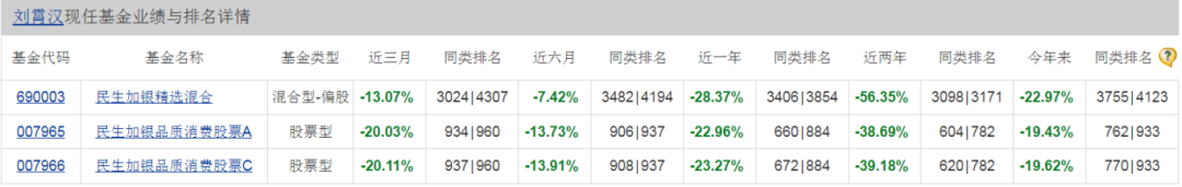 例如刘霄汉,累计任职时间10年又245天,也算是行业老将,但其现任基金业绩与排名一栏,同样是一片绿。其中,民生加银精选混合近两年亏了56.35%。