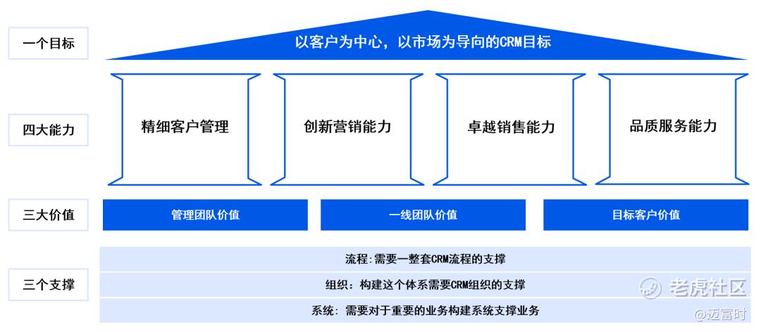 为了成功实现CRM的数字化转型,企业需要基于流程、组织和系统来构建相应的体系或工具,实现三大方面的价值: