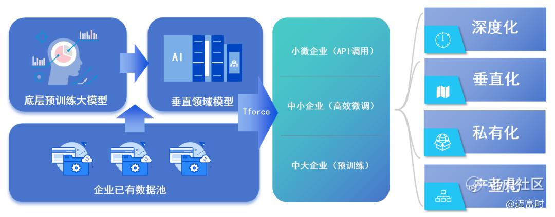 想让底层的算力、算法和数据发挥作用,需要关注其上层建筑:特定的行业和场景。例如,对于大型设备制造企业,大模型可能应用于财务、生产、人力资源或营销,而锁定场景和行业后,便形成了垂直大模型,这是提升新质生产力的核心引擎。而Tforce大模型的目标,就是成为在营销层面具有丰富的知识库储备,以及在营销任务执行上经过专业性和复杂性训练的智能体。