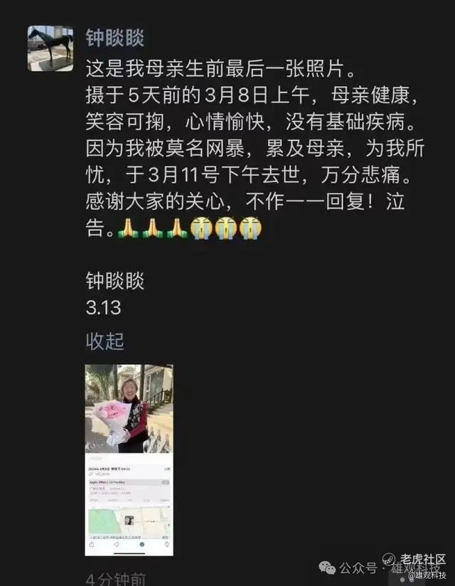 林林总总的谣言将农夫山泉和钟睒睒推到了风口浪尖,数量之多,时间之久,在民营企业发展史上极为少有。3月13日,钟睒睒本人在朋友圈更新了一条信息,其中附有一张其母拍摄于3月8日的照片,并表示“母亲健康,笑容可掬,心情愉快,没有基础疾病”。但“因为我被莫名网暴,累及母亲,为我所忧,于3月11号下午去世,万分悲痛”。