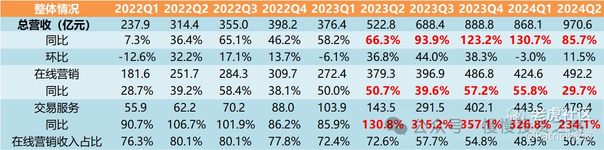 Q2拼多多营收900.6亿,同比增长85.7%,主要还是靠TEMU的增长。这个增速虽然依旧很恐怖,但是比前2个季度的增速已经低了不少,尤其是主站增速只有29%了,远低于之前的增速。