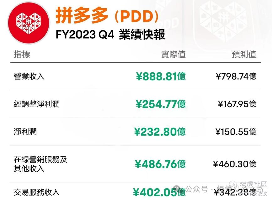 刚刚 $拼多多(PDD)$ 公布了2024年Q2财报,这次的财报数据跟之前终于有了不一样的地方。之前的财报数据依然只能用炸裂形容,连续N次超预期,而且营收和净利润能直接超预期将近100亿!先看看之前Q4财报实际值和机构的预测值差距,可以用离谱形容,营收机构预测少了将近100亿!