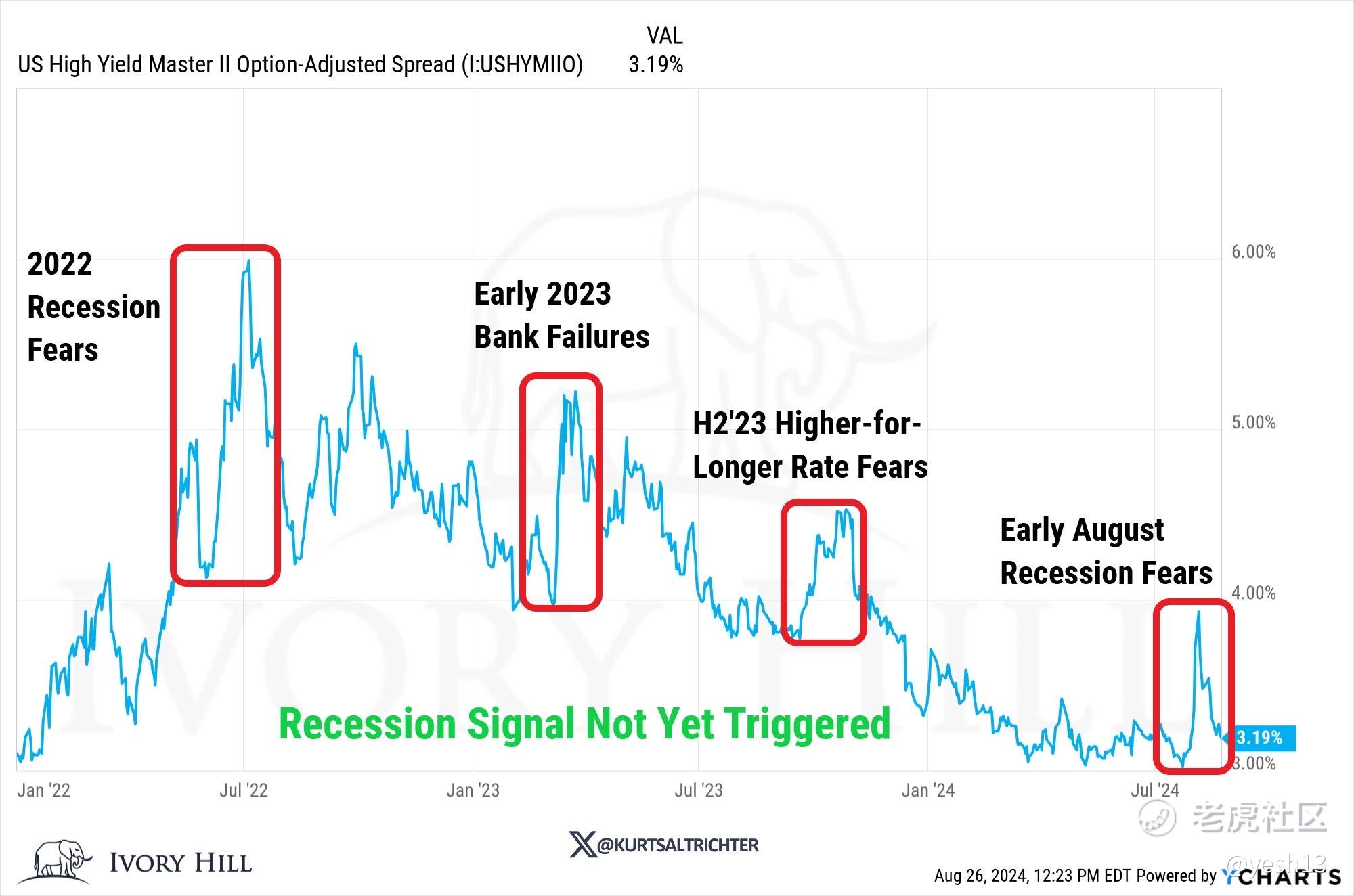 从历史上看,信用利差对股票投资者有很好的引导作用,信用利差收紧表明大量风险资金流入股票和高收益债券。然而,信用利差突然扩大至 52 周高点是需要监测的重要衰退警告。