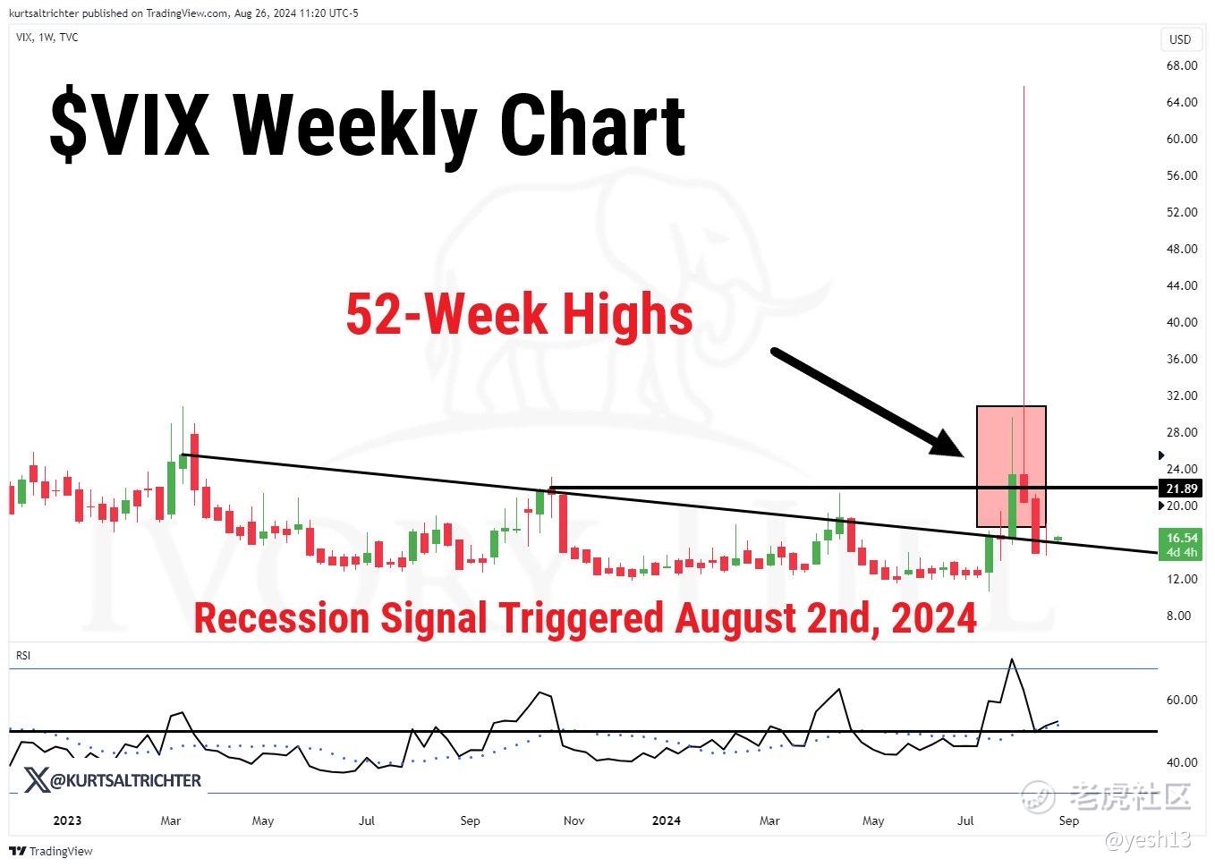 在周期后期$VIX通常保持低迷,高点较低,往往由于投资者自满情绪和拥挤的短期波动交易所致。但值得注意的是在近期历史上,VIX 的 52 周高点都先于每一次衰退熊市出现。