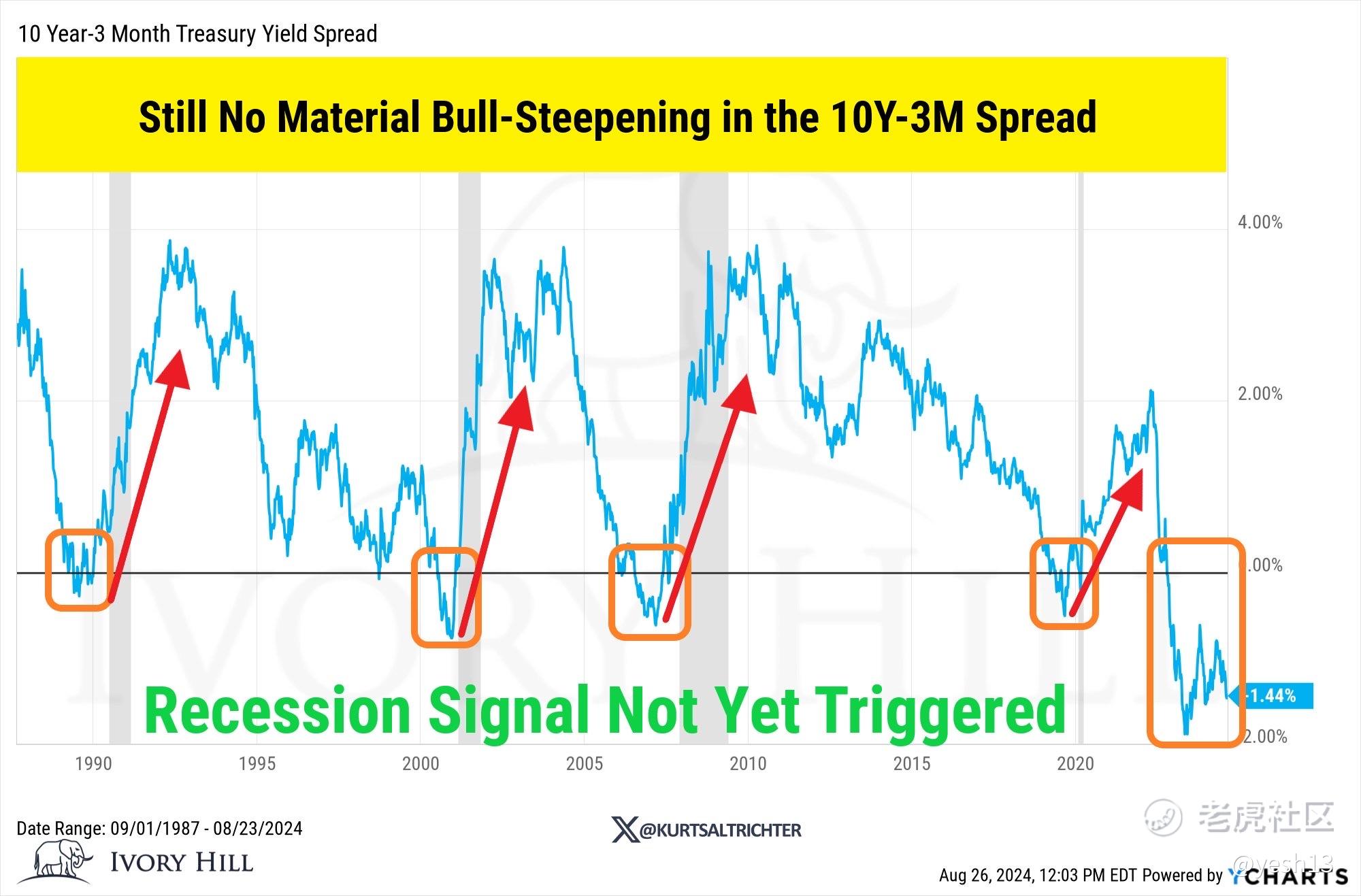 牛市期间收益率曲线倒挂并不是可以忽视的信号,但也不是可以立即采取行动的信号:许多周期性收益都发生在这种倒挂期间。相反,要密切关注 10 年期至 3 个月期收益率利差的快速牛市陡化,这是关键的衰退信号。