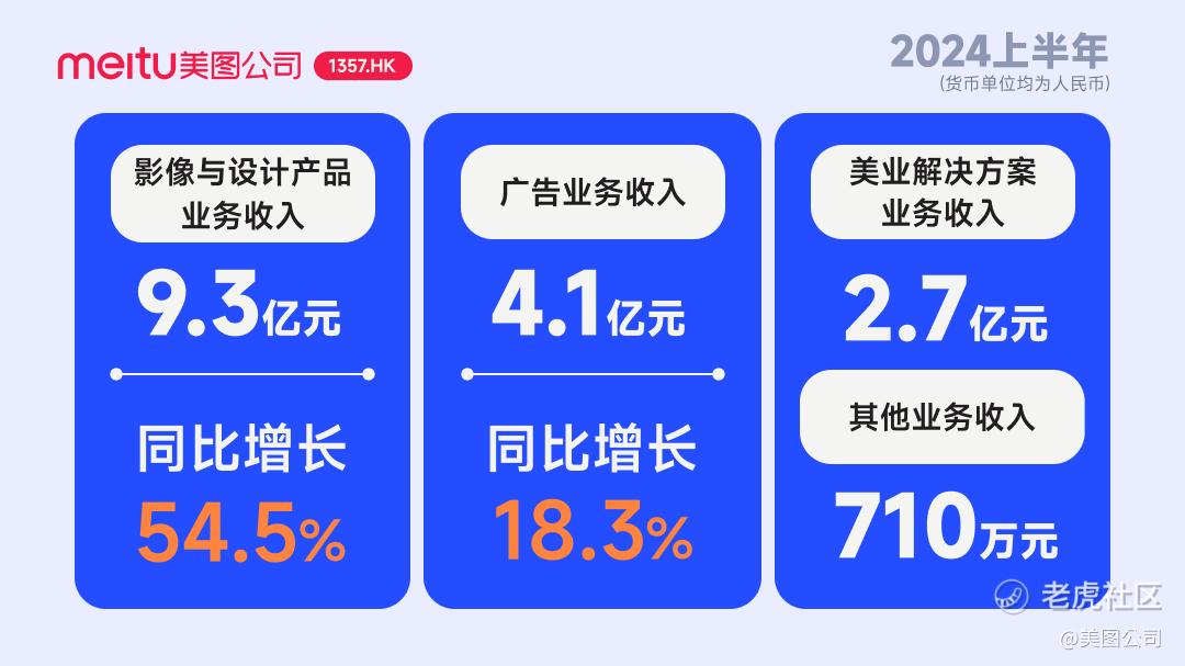 2024上半年,美图公司以付费订阅为主的影像与设计产品业务收入9.3亿元,同比增长54.5%,占总收入的57.4%;广告业务收入4.1亿元,同比增长18.3%;美业解决方案业务收入2.7亿元;其他业务收入710万元。