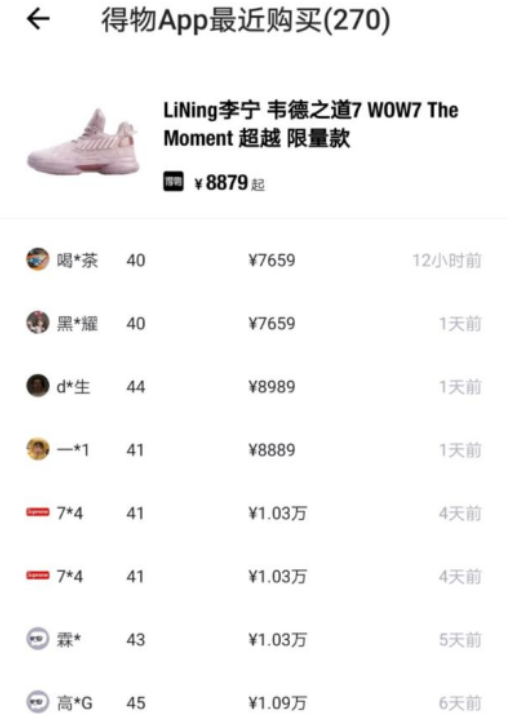 还有,【李宁韦德之道7 wow7 The Moment超越限量款】,41.5码最高售价为29999元,相比发售价1699元涨了近17倍。同时,得物APP上数据显示最近购买记录270条,12小时前刚成交一笔。