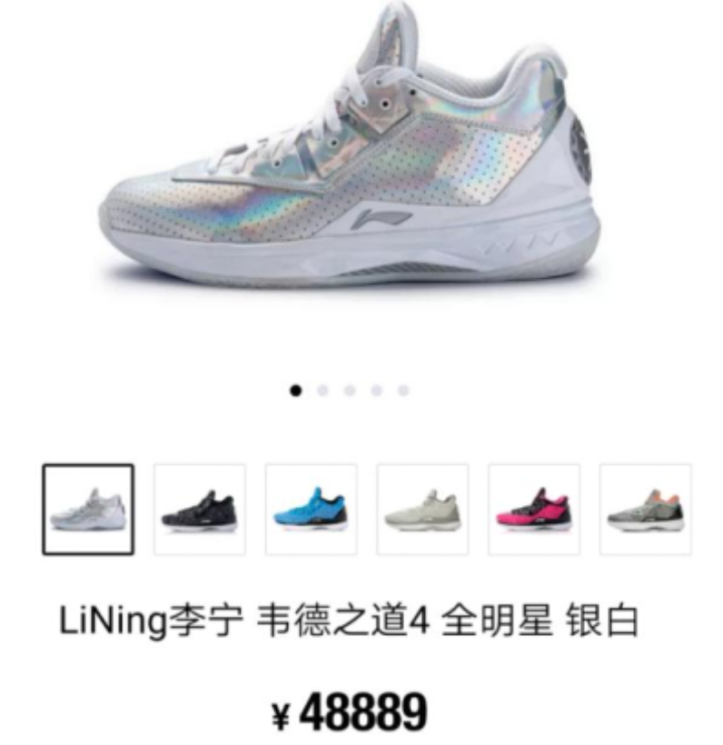 据了解,在得物APP上搜索,最夸张的【李宁·韦德之道4·全明星·银白款】,页面显示仅有42码,付款后7天内到货,售价竟高达48889元。而该鞋参考发售价仅1499元,涨幅达31倍!